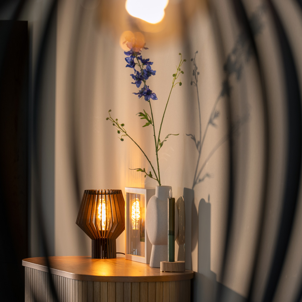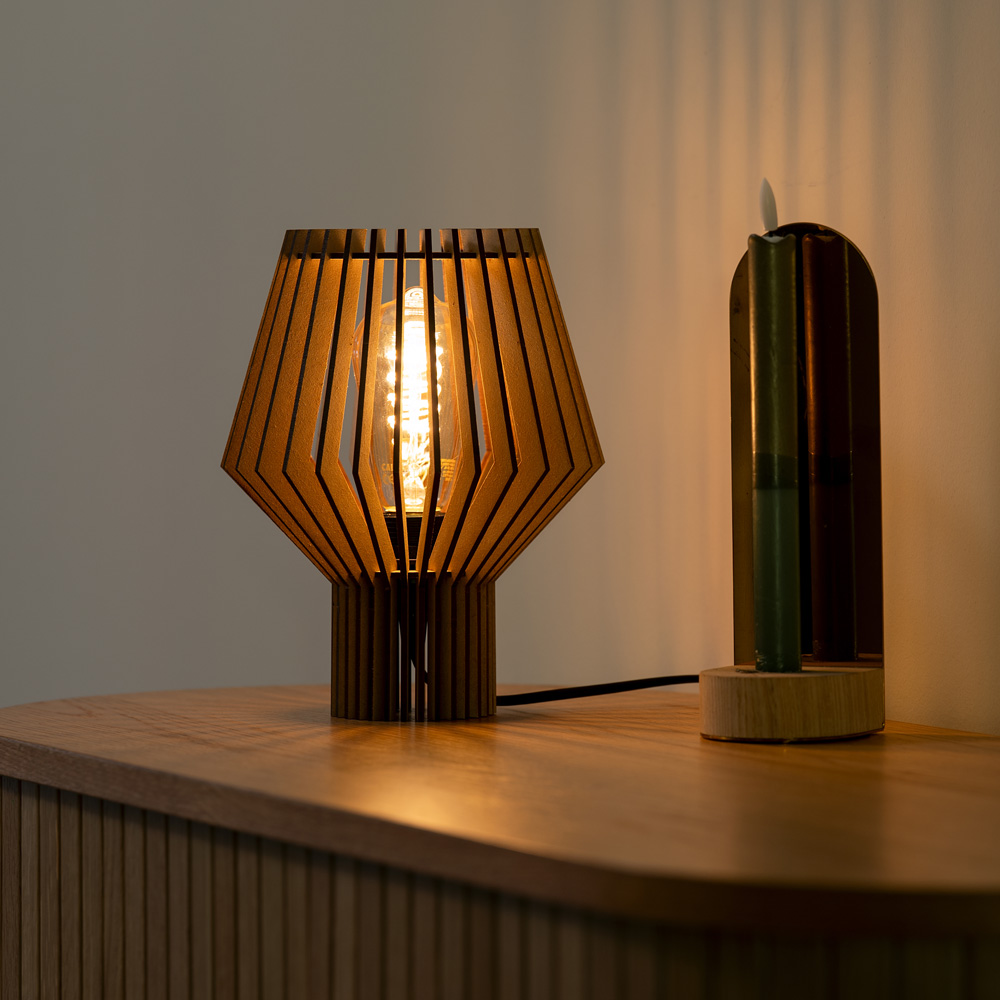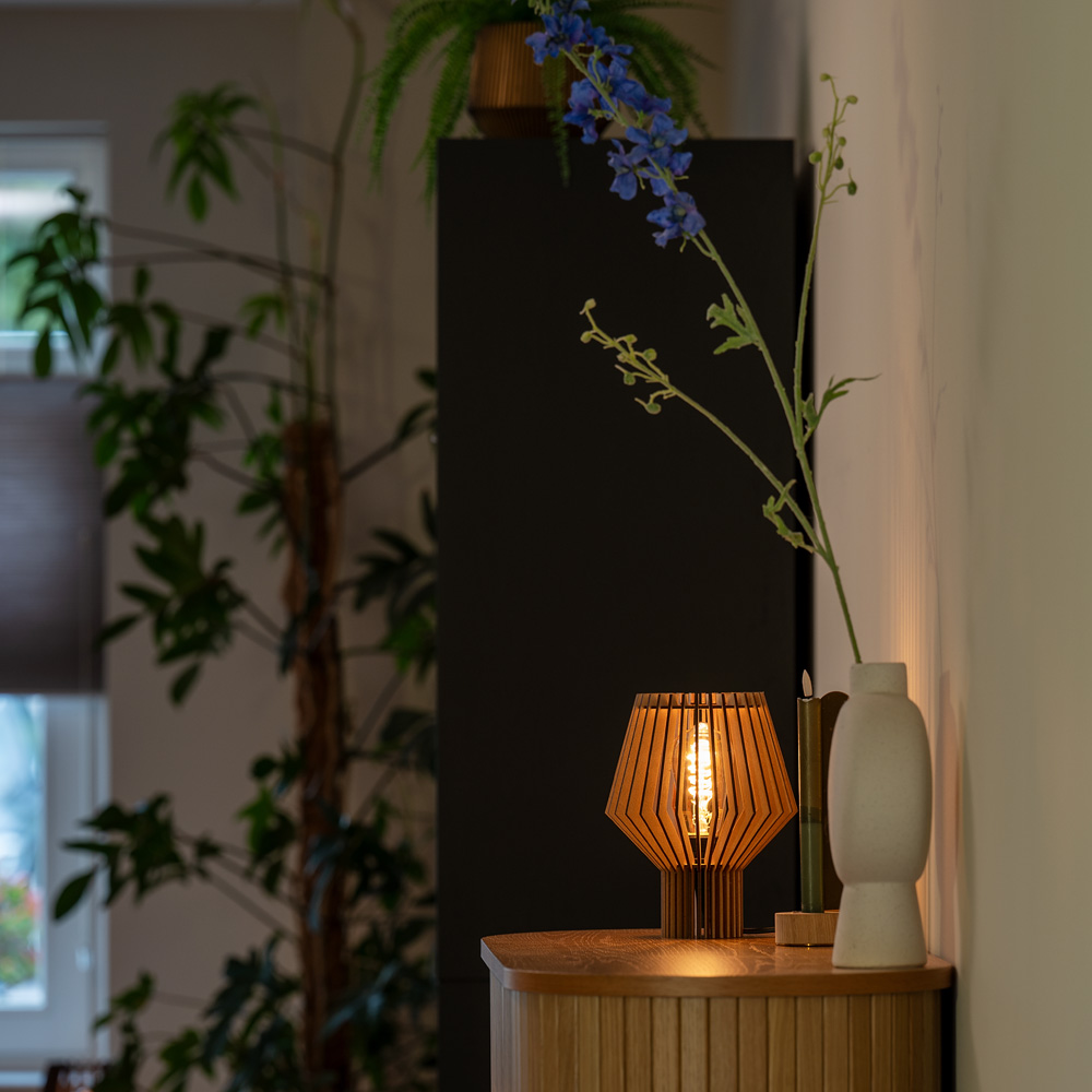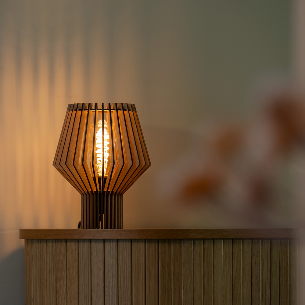 TUMI is een compacte houten tafellamp met dimbare fitting. Ideaal als nachtlampje of sfeerlamp in modern en natuurlijk interieur.